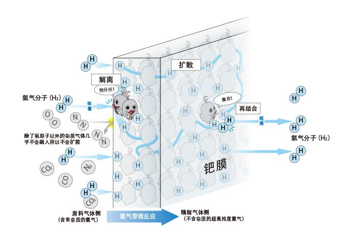 通常由鈀合金軋制而成,可制成膜片,簡稱鈀膜。膜厚通常為50~100微米。主要用于氫氣的純化,其原理是溶解—擴散模式,擴散的驅(qū)動力為膜兩側(cè)氫分壓差。